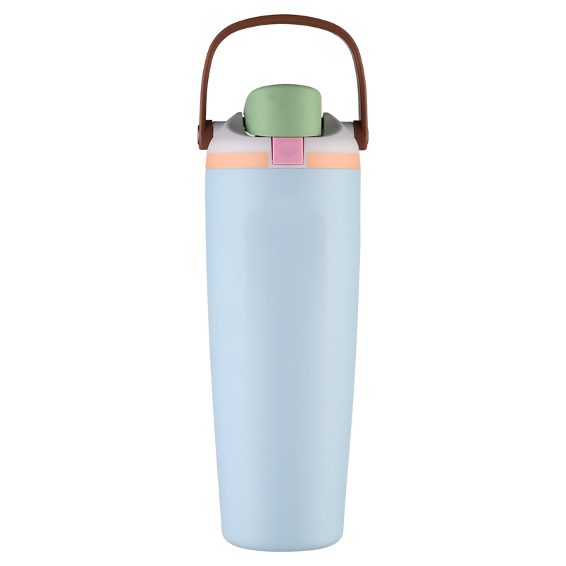 30oz large capacity Insulated Stainless Steel Water Bottle, with a leak-proof lid and a soft silicone bucket handle. The lid allows 2-way drinking (chug spout & built-in straw), and also features a push button that opens the spout easily. The bucket handle makes this bottle perfect for work, school, travel, and sports. Can be custom bulk manufactured.