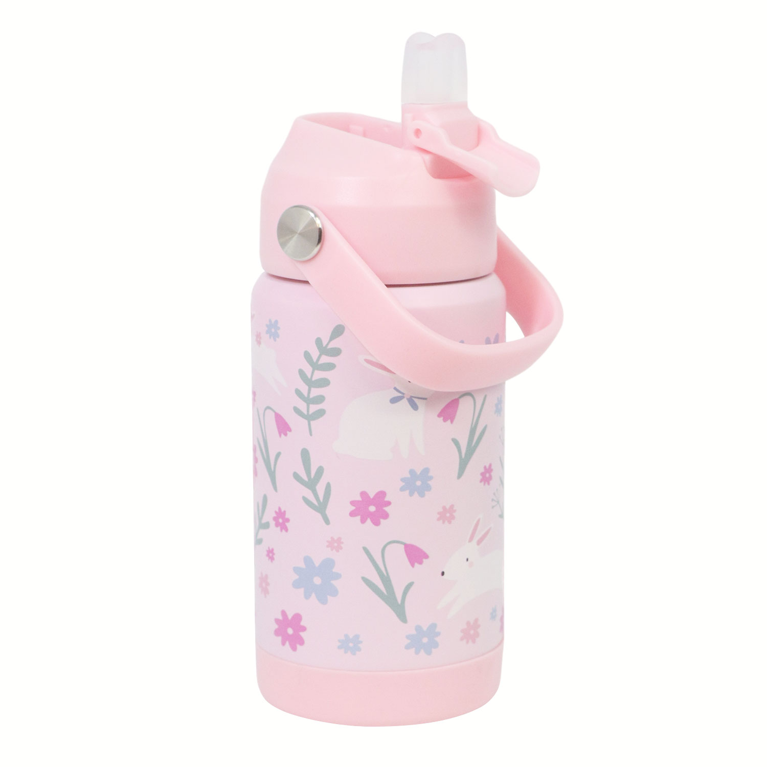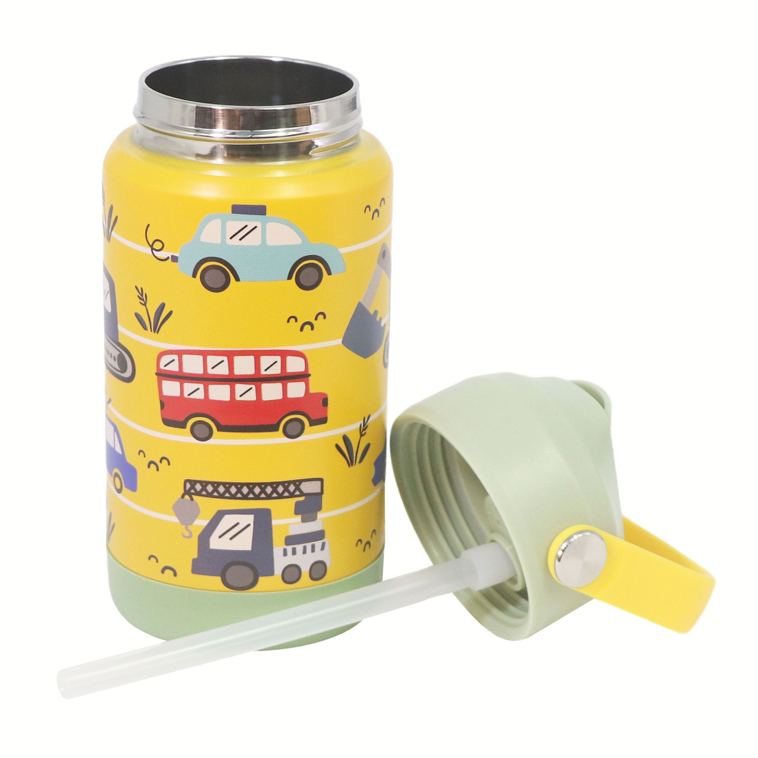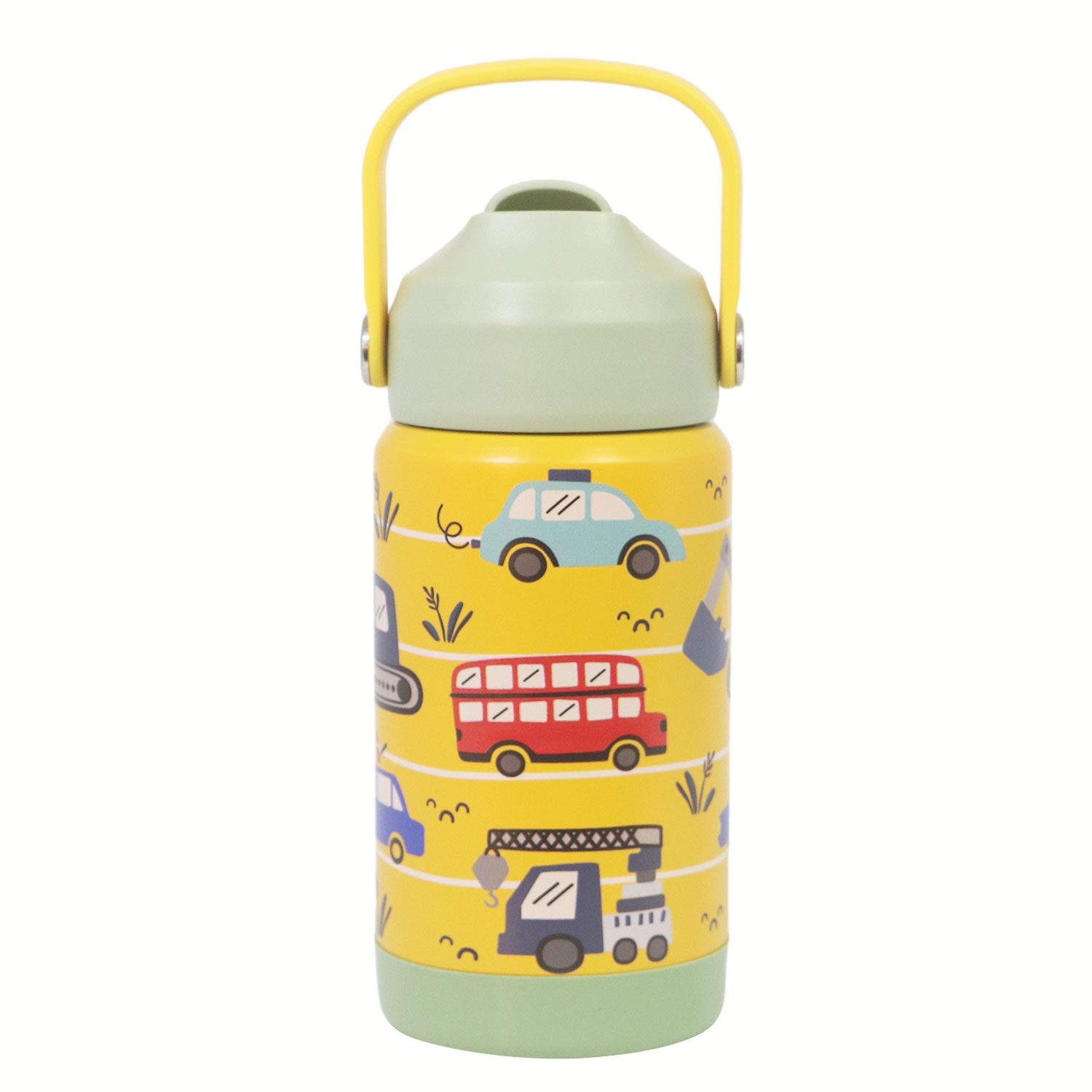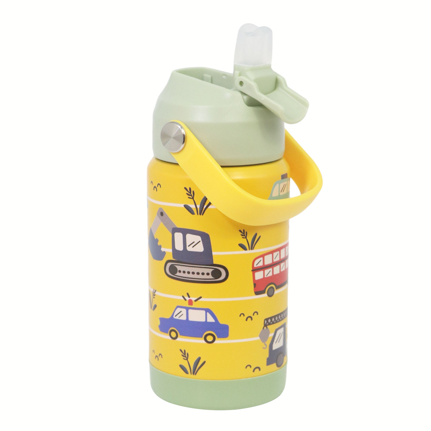 12oz Kids Stainless Steel Insulated Water Bottle, double wall vacuum insulated to keep drinks hot or cold for up to 12 hours, comes with comfortable grip carrying handle and medical grade silicone straw for easy drinking.