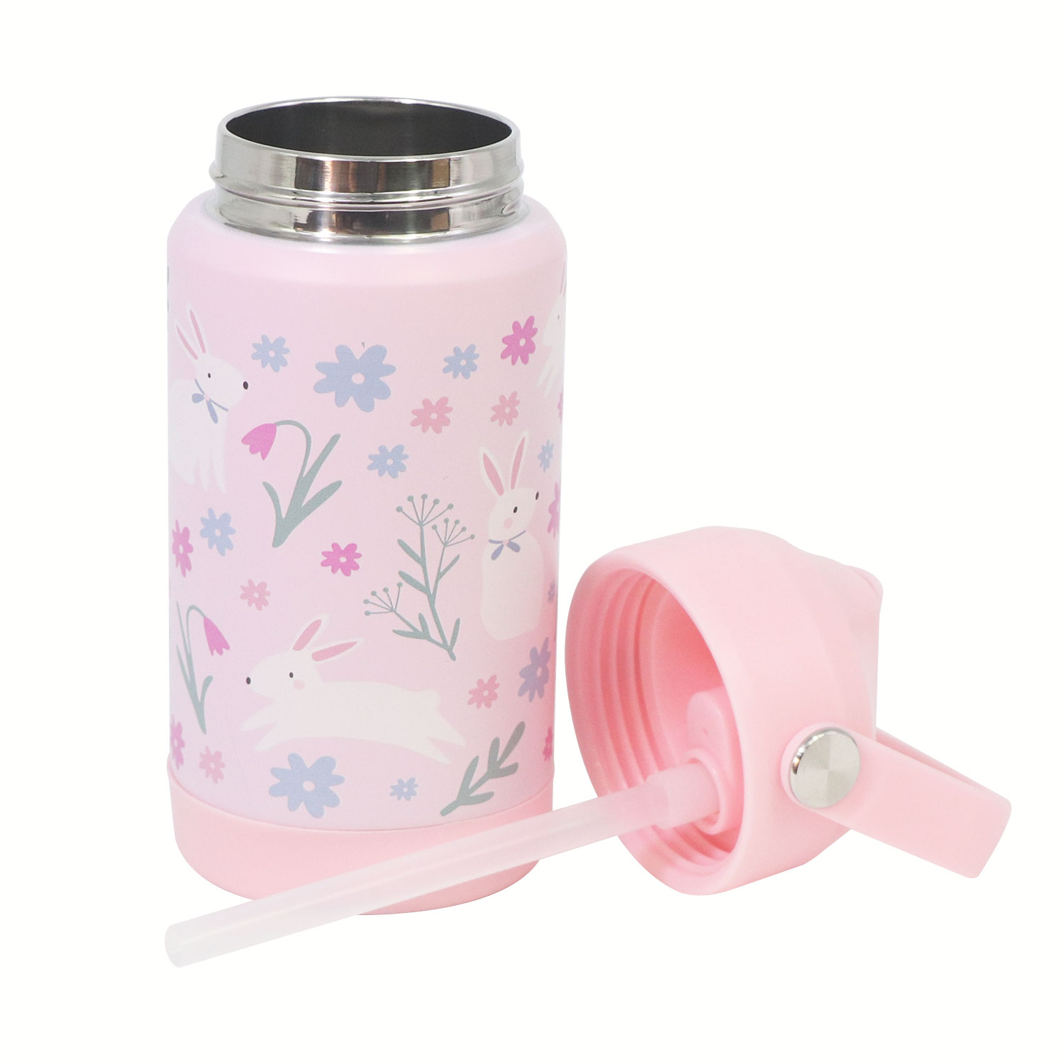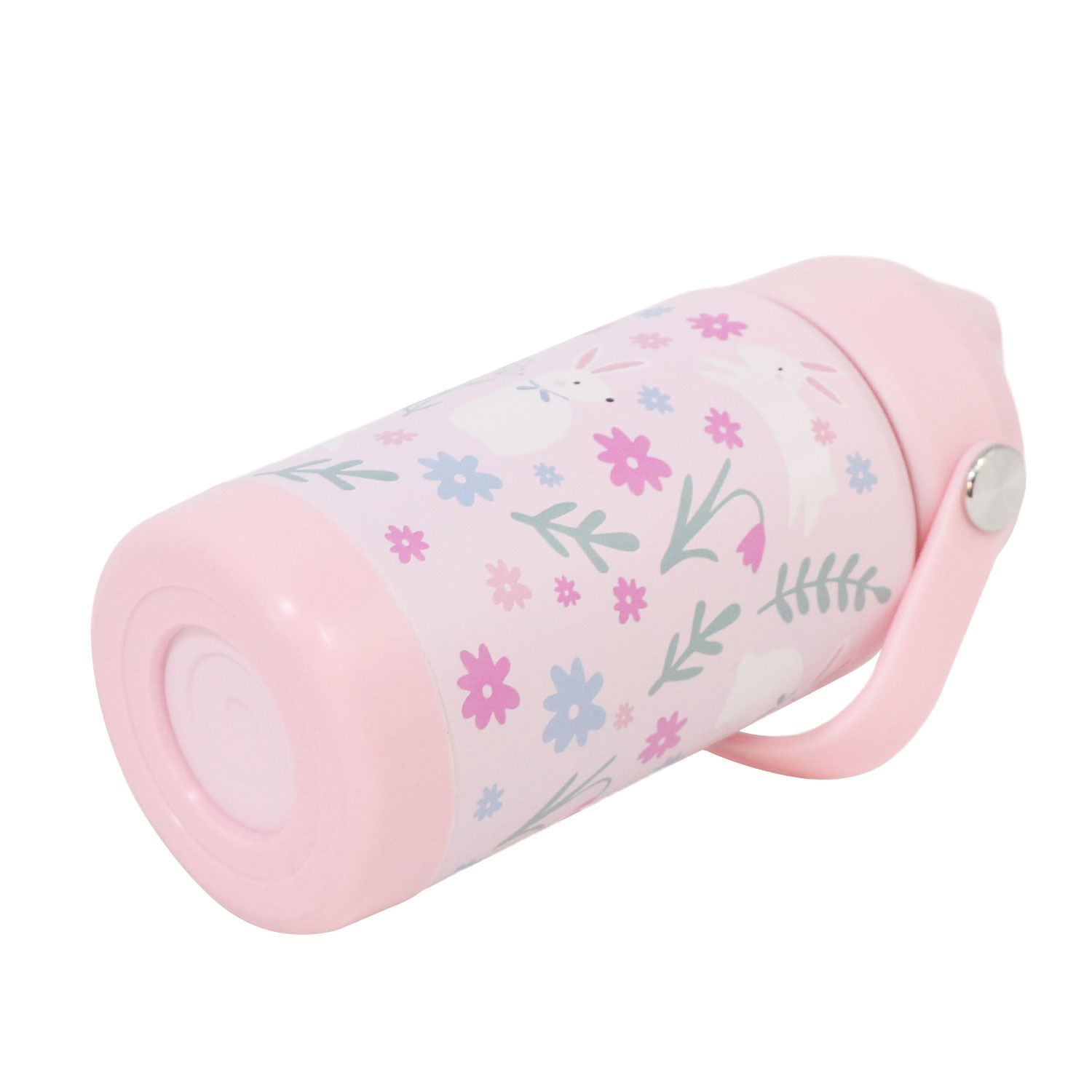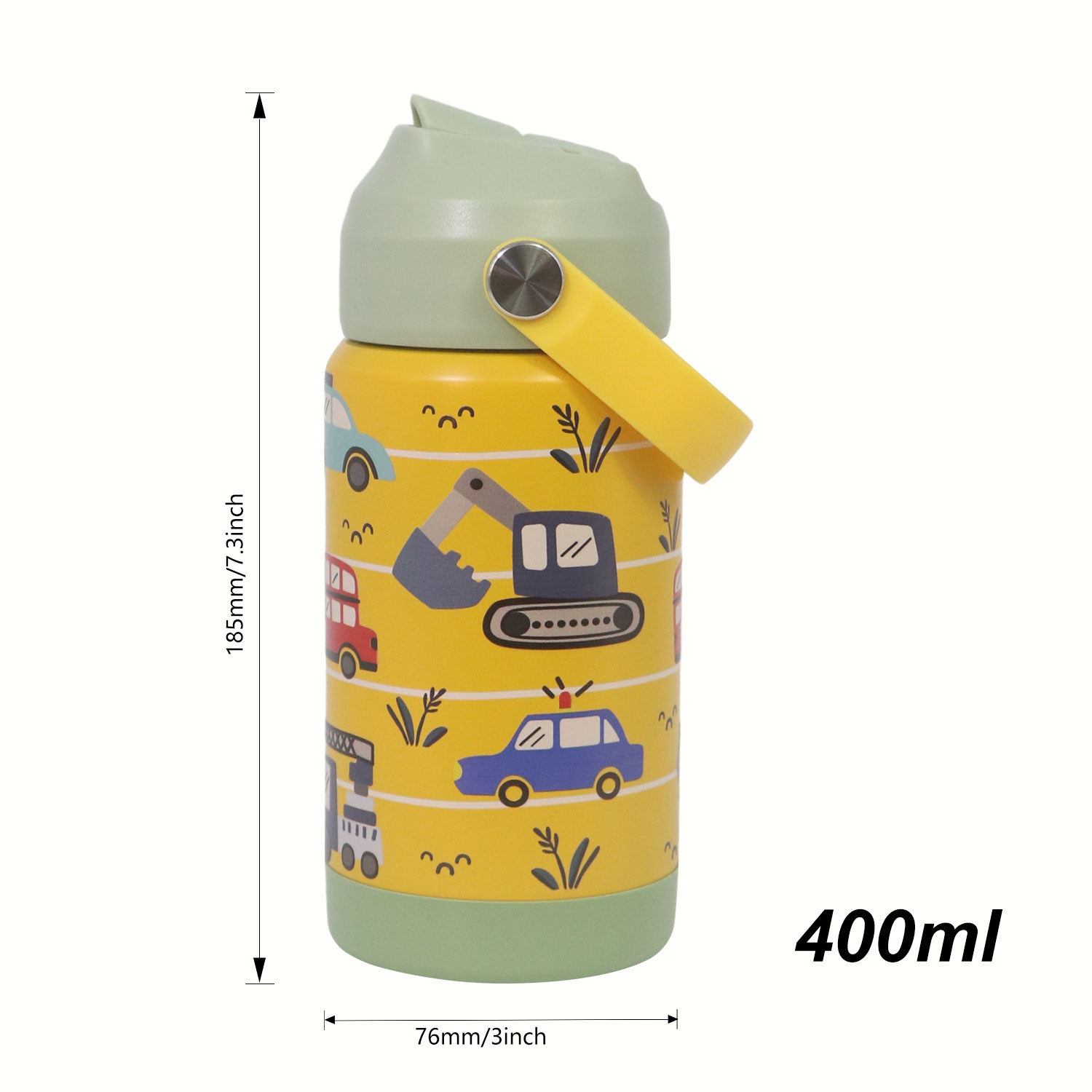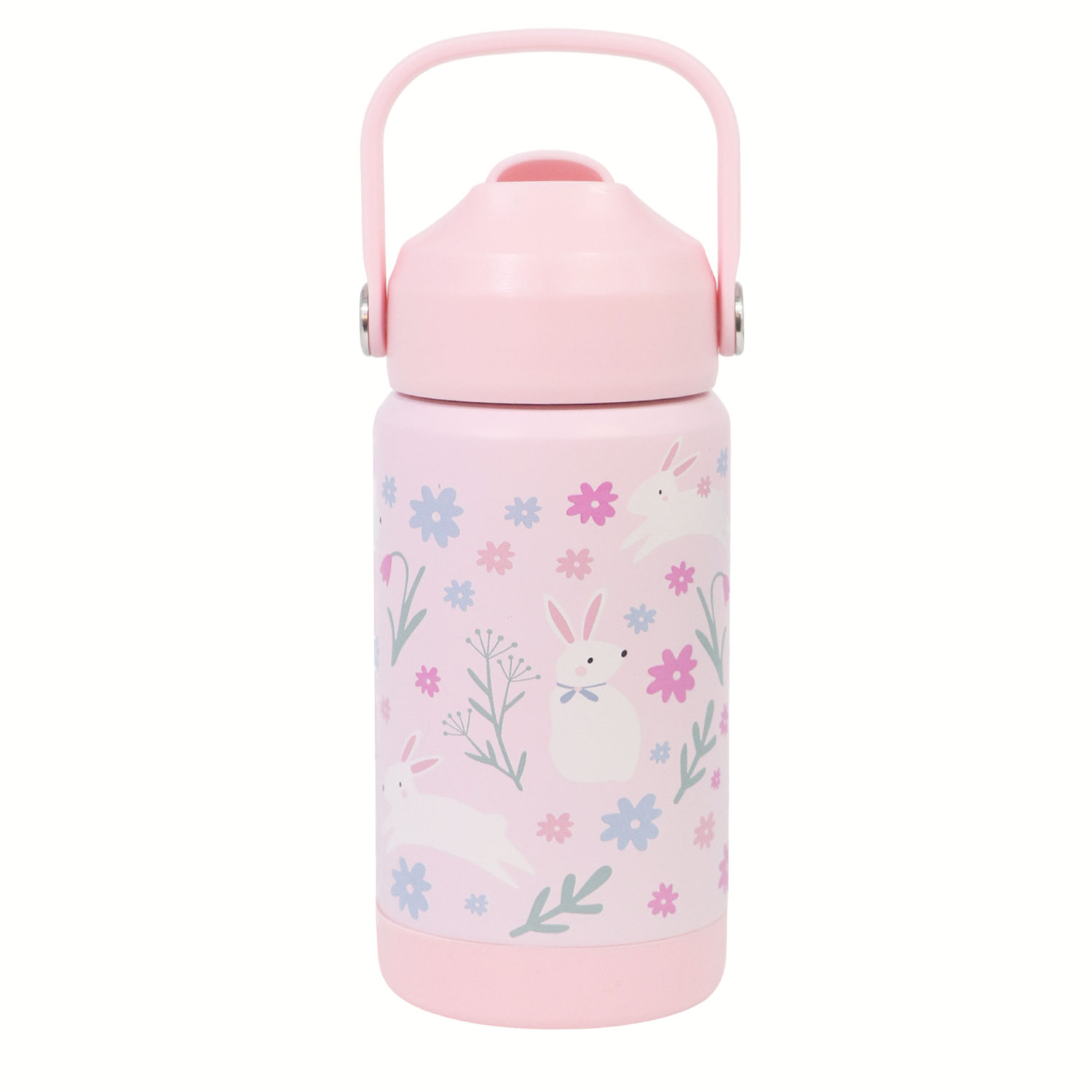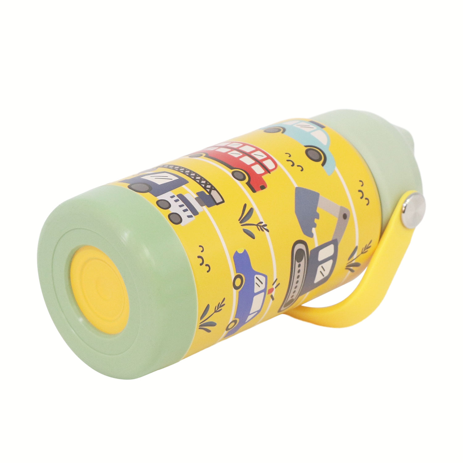 12oz Kids Stainless Steel Insulated Water Bottle, double wall vacuum insulated to keep drinks hot or cold for up to 12 hours, comes with comfortable grip carrying handle and medical grade silicone straw for easy drinking.